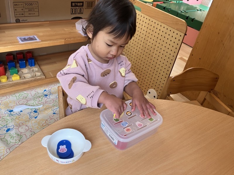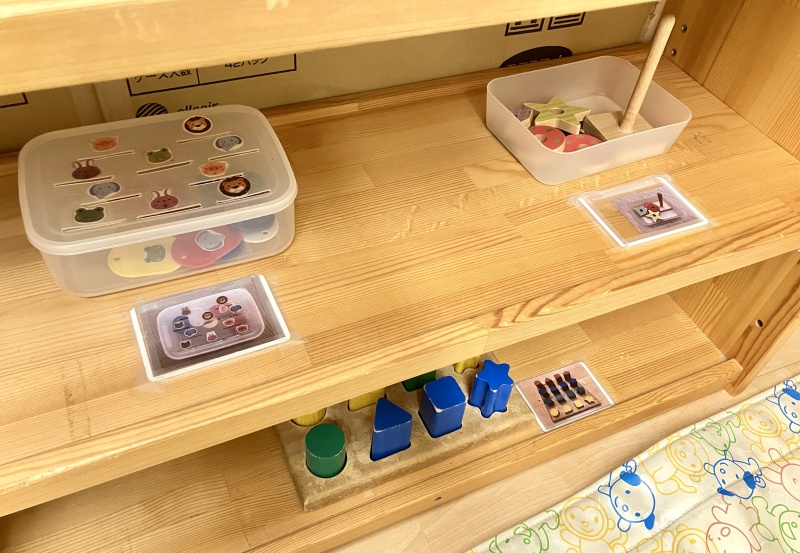 今の子どもたちの姿に合わせて部屋の環境や遊びの内容を変化させています。↓棚から遊びたい遊びを選んで手に取ることができるようにし、遊び終えたら元の場所に戻すことができるよう写真やイラストを貼っています。