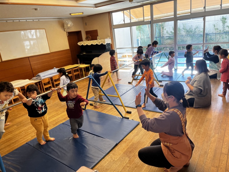 子どもたち自身が自らの意志で運動遊びを選び、主体性を育む安田式体育遊びを取り入れています。保育者は一方的にやり方を指導するのではなく、自分で考えて行動へ移せるような促し・声かけを意識しています。